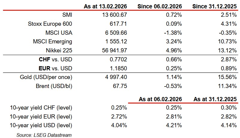 In a market lacking momentum, with the US and China closed, the €/$ is consolidating at 1.1860, sup. 1.1760, res. 1.1990. The single currency should benefit in the medium term from expectations of US rate cuts, which rose to 50% on Friday. Major geopolitical risks persist and are supporting the CHF: $/CHF 0.7687, sup. 0.76, res. 0.7770, €/CHF 0.9120, sup. 0.9050, res. 0.9200. Gold is at $5008/oz, sup. 4670, res. 5120.