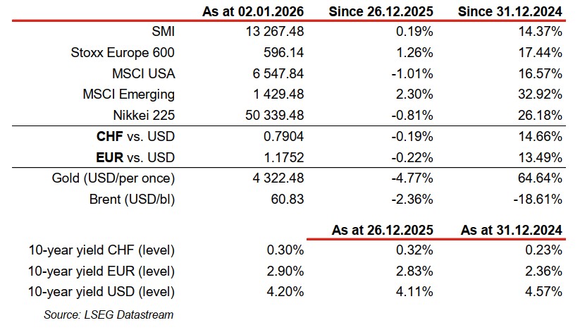 Analysis of last week’s asset performance is less relevant due to the New Year celebrations (the arrest of President N. Maduro by the US armed forces is not yet visible on the financial markets). Nevertheless, it is worth noting the 4.8% fall in gold prices: this looks more like profit-taking after its excellent performance over the year than the start of a trend reversal. To watch this week: ISM manufacturing and services, consumer confidence (University of Michigan) and US employment report; Sentix confidence index, retail sales, unemployment rate, producer and consumer price indices and EC confidence indices (economy, industry and services) in the eurozone; manufacturing and services PMI (S&P Global/RatingDog), producer and consumer price indices and foreign exchange reserves in China.