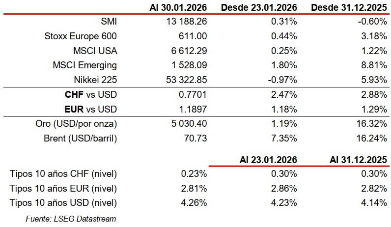 El anuncio del futuro nombramiento de K. Warsh al frente de la Reserva Federal, menos acomodaticio que otros candidatos, perturba los metales preciosos, con fuertes caídas el viernes y a la apertura. El oro cierra la semana con una subida del 1,2% y el índice del dólar pierde un 0,6%. Los márgenes soberanos a 10 años suben unos puntos en USD y caen ligeramente más en EUR. Las acciones emergentes (+1,8%) superan a las europeas (+0,4%) y estadounidenses (+0,3%). Seguimiento de la semana: EE.UU., ISM industrial y de servicios, confianza de hogares (Univ. de Michigan) e informe de empleo; zona euro, índices de precios de consumo y de producción, ventas minoristas y reunión del BCE; China, PMI industrial y de servicios (oficiales y de RatingDog).