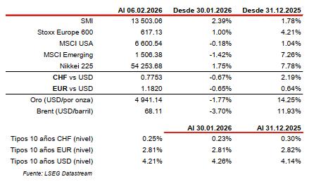Semana muy volátil; las acciones cierran con resultados dispares (Europa: +1%; EE.UU.: -0,2%; emergentes: -1,4%). La victoria de S. Takaichi este fin de semana en Japón es bien recibida por los inversores. El esperado statu quo del BCE no altera los márgenes soberanos a 10 años en EUR. Las decepcionantes cifras de empleo en EE.UU. provocan una caída de 5pb en los tipos en USD, sin impedir la apreciación del índice del USD (+0,7%). Seguimiento de la semana: EE.UU., confianza de pymes (índice NFIB), índices de precios al productor y al consumidor, ventas minoristas e informe de empleo; zona euro, producción industrial; China, índices de precios al productor y al consumidor.