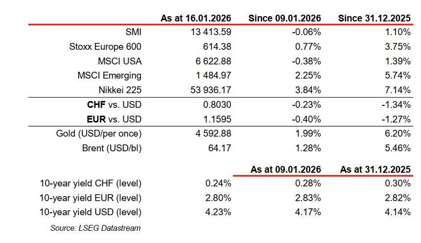 Donald Trump’s threats over the weekend to raise tariffs on certain European countries due to disagreements over Greenland are keeping international tensions high as the WEF in Davos opens its doors. Over the past week, 10-year sovereign yields rose by 6 basis points in USD and fell by a few basis points in EUR. The USD index rose by +0.3%, but this did not prevent gold from gaining +2%. Emerging market equities (+2.3%) and European equities (+0.8%) outperformed US equities, which fell slightly (-0.4%). This week to watch: PCE inflation and manufacturing and services PMI in the United States; consumer confidence and manufacturing and services PMI in the eurozone; Q4 GDP, house prices, retail sales, investment and industrial production in China.