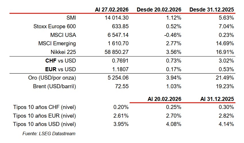 El inicio del conflicto en Irán provoca a principios de semana un aumento de la aversión al riesgo. La semana pasada, los márgenes soberanos a 10 años caen más de 10pb en USD y 8-9pb en EUR. Las acciones de EE.UU. siguen registrando un rendimiento inferior (-0,4%; Europa: +0,5%); los mercados emergentes están en cabeza (+2,8%). La ligera depreciación del dólar (índice: -0,2%) favorece al oro (+3,9%) y al petróleo (+1%). Seguimiento de la semana: EE.UU., ISM industrial y de servicios, ventas minoristas e informe de empleo; zona euro, índices de precios de consumo y de producción, ventas minoristas y tasa de desempleo; China, PMI industrial y de servicios (oficiales y de RatingDog).