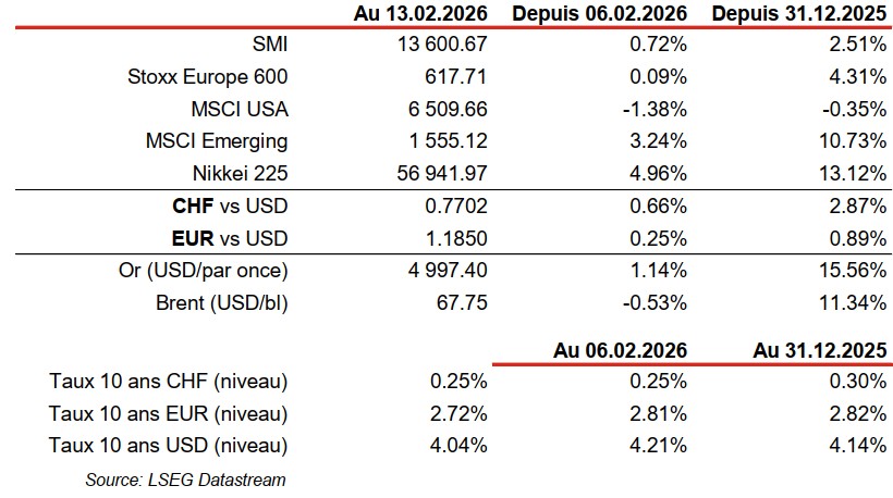 Les statistiques publiées aux États-Unis ont été en demi-teinte. Le ralentissement de la croissance des prix, de +2.7% à +2.4% a/a (vs +2.5% est.) en janvier a été une bonne surprise. De même, le nombre d’emplois créés le même mois (+130’000) a largement dépassé les attentes (+65’000). Néanmoins, les révisions pour l’année 2025 ont été fortement négatives (de +48’000/mois à +15’000/mois après révisions). La stagnation en décembre des ventes de détail (vs +0.4% m/m est.) a été une déception tout comme le recul de la confiance des PME (NFIB) en janvier (de 99.5 à 99.3 vs 99.8 est.). Dans la zone euro, la confiance des investisseurs (Sentix) remonte plus qu’attendu, de -1.8 à +4.2 (vs 0 est.) en février. En Chine, la contraction des prix à la production est moins forte qu’attendu en janvier (-1.4% a/a vs -1.5% est.) mais la progression de ceux à la consommation (+0.2% a/a vs +0.4% est.) est encore trop faible.